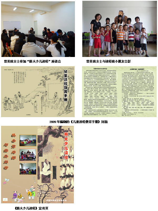 1、與山東師范大學齊(qi)魯(lu)文化(hua)(hua)研(yan)(yan)究中心合作(zuo)舉(ju)辦薪(xin)火少兒讀(du)(du)經(jing)(jing)班(ban)(ban)4期,并(bing)于08年12月7日特(te)別邀請北京大學哲學系(xi)博士(shi)(shi)研(yan)(yan)究生曾美珠(zhu)女士(shi)(shi)與讀(du)(du)經(jing)(jing)班(ban)(ban)教師和家(jia)長在齊(qi)魯(lu)文化(hua)(hua)研(yan)(yan)究中心,就讀(du)(du)經(jing)(jing)的方法以(yi)及(ji)讀(du)(du)經(jing)(jing)過程中經(jing)(jing)常(chang)遇到的問題(ti)等進(jin)行了座談(tan)與交流;同時(shi)雙方合作(zuo)出版《齊(qi)魯(lu)文化(hua)(hua)》雜志(zhi)共3期。
