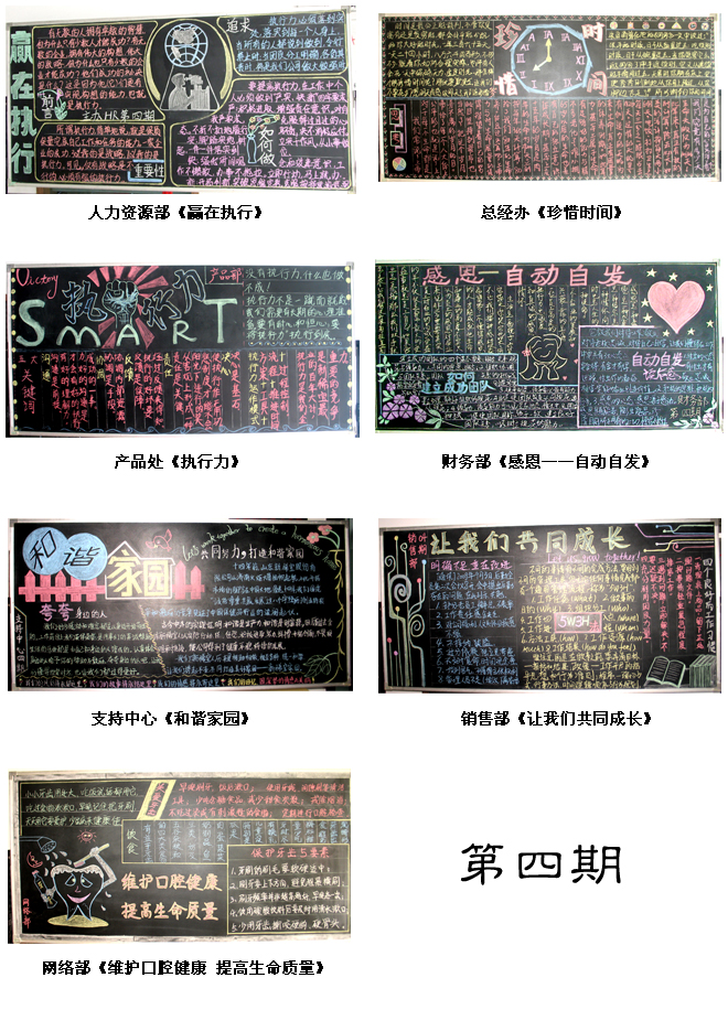 在(zai)黑板(ban)報(bao)制作(zuo)過(guo)程中,各部門投入(ru)了極大(da)的(de)熱情,積(ji)極查找資料,充(chong)分發(fa)揮各自(zi)的(de)優(you)勢和特長,巧(qiao)妙(miao)設(she)計版面,努力做到主(zhu)題突(tu)出、內(nei)容(rong)豐富(fu)、構思巧(qiao)妙(miao)、形式(shi)多樣、圖文并茂、精彩紛呈。 第四、五期黑板(ban)報(bao)整體上更是(shi)以內(nei)容(rong)豐富(fu)、主(zhu)題鮮明、形式(shi)新穎(ying),受(shou)到大(da)家的(de)一致(zhi)喜愛。
