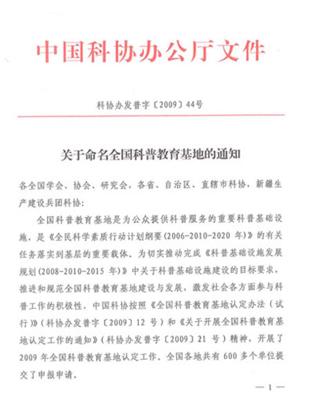 2009年9月,中(zhong)國科(ke)協組織(zhi)(zhi)開(kai)展(zhan)了(le)為期3個月的(de)(de)第一、二批全(quan)國科(ke)普教育(yu)基地綜合評(ping)(ping)估工作,我(wo)單(dan)位也積極遞(di)交了(le)全(quan)國科(ke)普教育(yu)基地的(de)(de)申請。經(jing)全(quan)國學會、省(sheng)級科(ke)協等推薦單(dan)位對本轄(xia)區、本系統全(quan)國科(ke)普教育(yu)基地的(de)(de)測評(ping)(ping),中(zhong)國科(ke)協組織(zhi)(zhi)專家進行(xing)了(le)細致認真(zhen)的(de)(de)評(ping)(ping)審和(he)抽查,全(quan)國僅認定科(ke)普教育(yu)基地200多家。我(wo)單(dan)位以(yi)良好(hao)的(de)(de)硬件設施和(he)突(tu)出的(de)(de)科(ke)普工作業績在數百(bai)家申報單位中(zhong)脫穎而出,順利通過認定(ding),成為全國(guo)微量元(yuan)素領域中(zhong)唯(wei)一一家被國(guo)家科協命名的科普教(jiao)育(yu)基地。