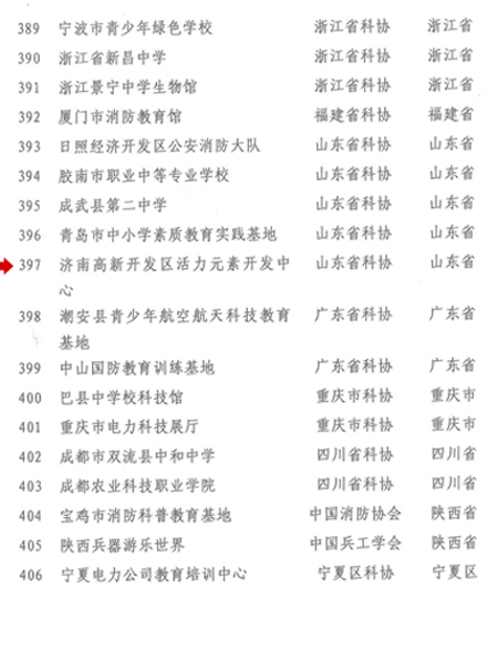 濟南高新開發區活(huo)力元(yuan)素(su)開發中心于2009年12月(yue)被中國科協命名為“全國科普教(jiao)育(yu)基地”,這是(shi)繼2007年10月被山東省科協命(ming)名為“山東省科普(pu)教育基地”、2008年(nian)9月被濟南市科協命(ming)名為“濟南市科普教育基地”之后,獲得的(de)又一(yi)項榮譽(yu)。