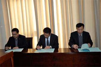 簽訂監管承諾書 杜經理與其他兩位公司代表上(shang)臺領取獎牌