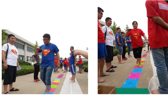 “心有靈犀”結束后,藍隊紅隊穿好隊服轉戰到戶外,大家的激情遠遠超過了戶外天氣的熱度。主持人剛剛講解完比賽規則,大家就投入到了比賽活動中,一個個隊員光著腳板在指壓板上快速前進,手上還小心翼翼的用乒乓球拍端著乒乓球,眼睛目不轉睛的盯著球拍上的乒乓球,臉上用各種表情來表達腳板的感覺和對球拍上乒乓球的關注。每個隊員都成功的端著球走過了指壓板,大家熱烈地討論并分享著自己的感受。