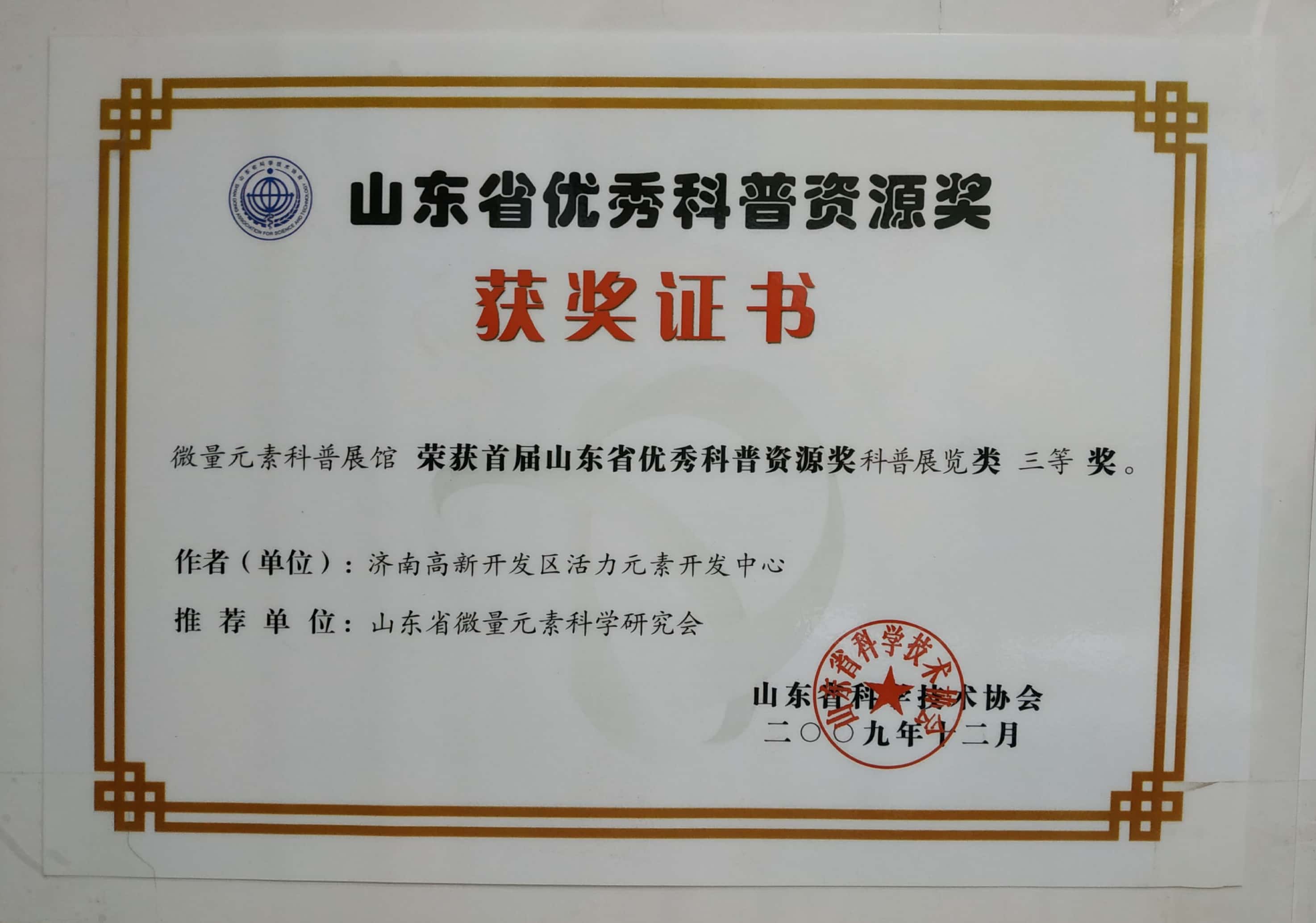 2009年被山(shan)東省科(ke)學技術協會評為(wei)“山(shan)東省優秀(xiu)科(ke)普(pu)資(zi)源獎”