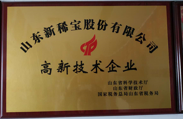 2018年,山東新稀寶(bao)股(gu)份(fen)有限公司(si)被山東省(sheng)(sheng)科學技(ji)術(shu)廳、山東省(sheng)(sheng)財政廳、國家稅務(wu)總局山東省(sheng)(sheng)稅務(wu)局評為“高新技(ji)術(shu)企業”