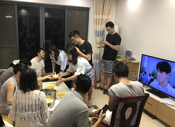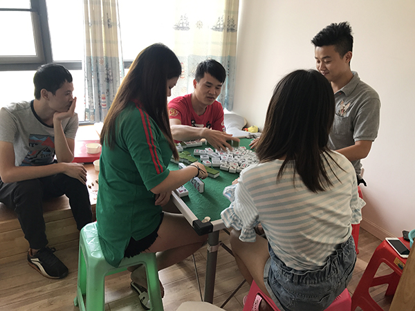 相較于廚(chu)房內(nei)的(de)(de)(de)(de)熱火朝天(tian),客廳里卻是(shi)另一番(fan)景象。大(da)(da)家(jia)就像(xiang)是(shi)在自(zi)己家(jia)里一樣,放(fang)松(song)(song)地(di)坐在沙(sha)發上(shang)聊天(tian)、看電視、吃水果,還有的(de)(de)(de)(de)同事(shi)湊成桌打麻將,偶爾(er)聽廚(chu)房 里大(da)(da)廚(chu)們的(de)(de)(de)(de)“差遣”打打下手。相比于工(gong)作時間內(nei)的(de)(de)(de)(de)合(he)作,這個時候的(de)(de)(de)(de)大(da)(da)家(jia)更(geng)像(xiang)是(shi)一家(jia)人(ren),相處更(geng)放(fang)松(song)(song)、更(geng)愜意。多了工(gong)作以(yi)外的(de)(de)(de)(de)接觸和了解,相信(xin)大(da)(da)家(jia)以(yi)后在工(gong)作 中溝通更(geng)加順(shun)利、合(he)作更(geng)加親密無(wu)間。