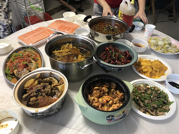 沒想(xiang)到平時工作(zuo)能力杠杠的同事們(men),做起菜(cai)來也絲毫不遜色。沒過(guo)多久菜(cai)已經陸(lu)續(xu)上桌,有(you)(you)毛毛做的紅(hong)燒魚與水煮牛肉,米粒做的菜(cai)包釀(niang)、咸蛋炒南(nan)瓜(gua);陶大(da)神做的 佛跳墻、蟹黃煲、椰香蝦;潤姐的燒鴨、西(xi)芹紅(hong)椒炒白果、涼拌木耳;寧(ning)寧(ning)的炒花(hua)甲螺;振宇做的青椒炒肉;芳芳的芒果西(xi)米露。一大(da)桌菜(cai)色香味(wei)俱全(quan)、品種多樣(yang), 飯前涼菜(cai)、家常炒菜(cai)、營(ying)養豐盛的大(da)菜(cai)以及飯后甜點(dian)應有(you)(you)盡(jin)有(you)(you)。