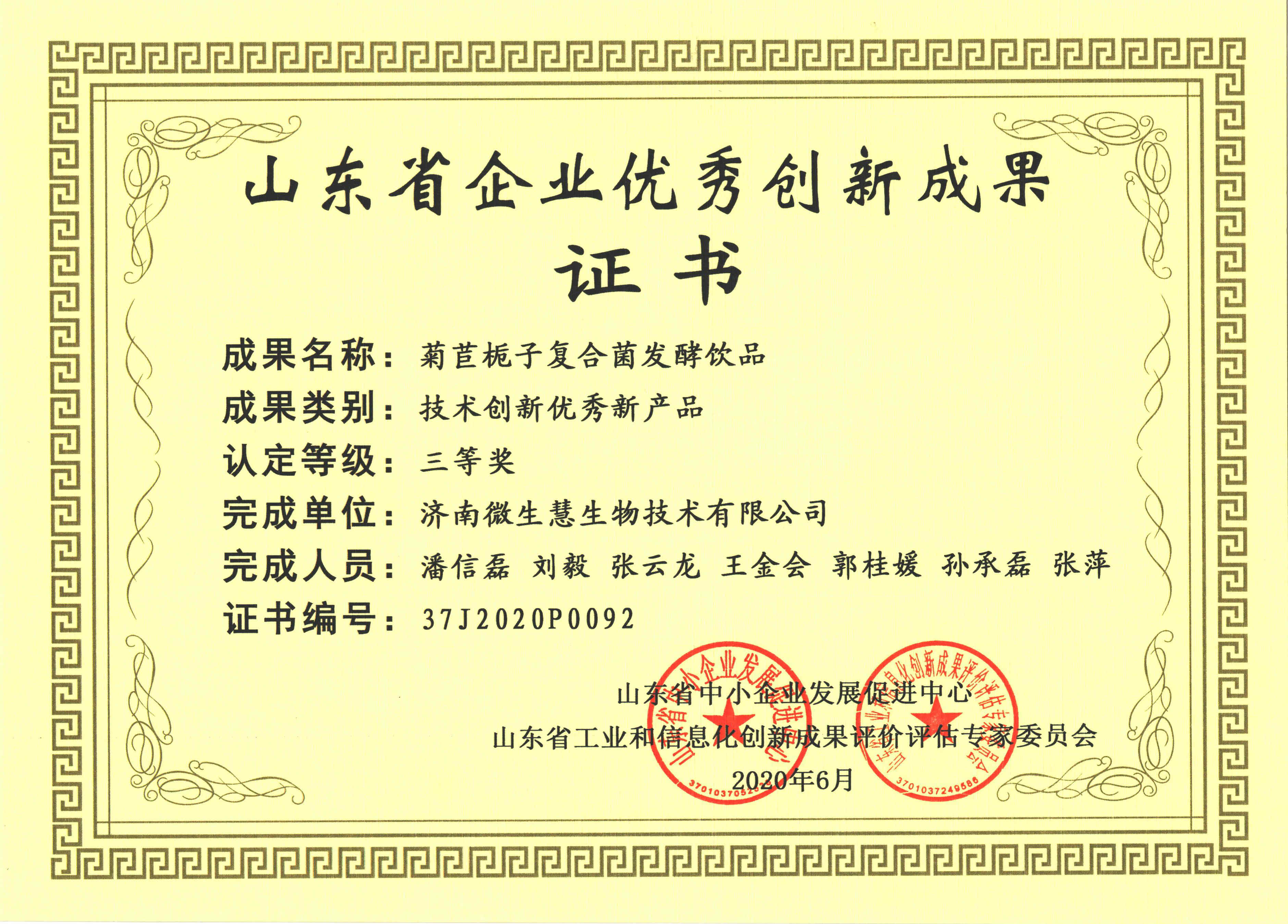 菊苣(ju)梔子復合菌發酵飲品獲(huo)得技術創新優秀(xiu)新產(chan)品三等獎